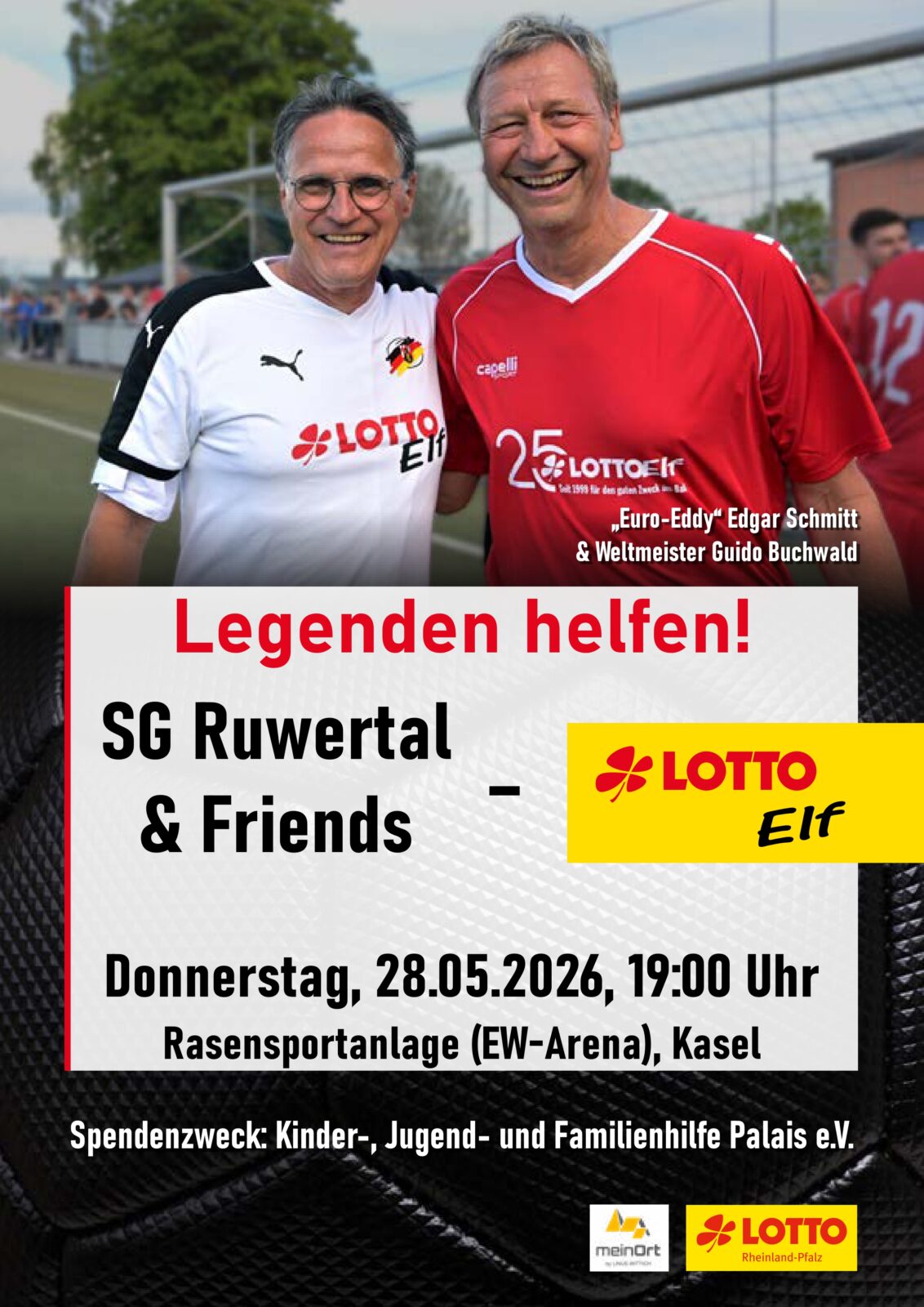 Ende Mai wird der Kaseler Rasen Austragungsort einer ganz besonderen Spiel: Zum 50-jährigen Geburtstag des Palais e.V. tritt eine Auswahl der SG Ruwertal und Freunden gegen die Lotto-Elf Rheinland-Pfalz an. Die Lotto-Elf Rheinland-Pfalz, besetzt mit ehemaligen Europa- und Weltmeistern – unter anderem Hans-Peter Briegel, Thomas Helmer, den Weltmeistern von 1990 Guido Buchwald und von 2014 Erik Durm – sowie weiteren ehemaligen National- und Bundesligaspielern wie Dariusz Wosz, Stephan Engels und David Odonkor, steht für ein attraktives Sportereignis mit hoher Strahlkraft. Mit Edgar Schmitt („Euro-Eddy“) begleitet eine echte Fußballikone die Lotto Elf als Teammanager auf und neben dem Platz.