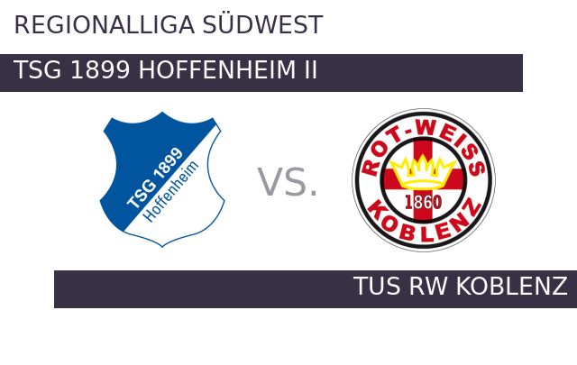 TuS RW Koblenz konnte in den letzten sechs Spielen nicht punkten. Mit der Reserve von 1899 Hoffenheim wartet am Sonntag auch noch ein starker Gegner. TSG 1899 II kam zuletzt gegen SG Barockstadt Fulda-Lehnerz zu einem 1:1-Unentschieden. TuS RW Koblenz erntete am letzten Spieltag nichts und ging mit 0:1 als Verlierer im Duell mit VfR Wormatia 08 Worms hervor.