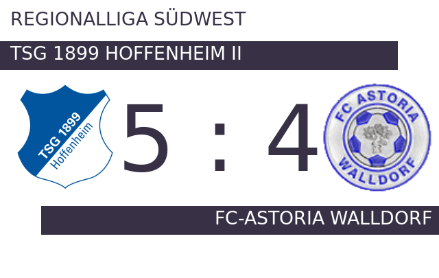 FCA Walldorf legte los wie die Feuerwehr und ließ durch einen Doppelschlag von Niklas Antlitz aufhorchen (11./13.). Vor 295 Zuschauern keimte bei 1899 Hoffenheim II dank des Anschlusstreffers von Muhammed Damar aus der 17. Minute noch einmal Hoffnung auf. Per Elfmeter erhöhte Antlitz in der 26. Minute seine Torausbeute an diesem Tag auf drei Treffer – 3:1 für FCA. Sören Dieckmann war es, der in der 32. Minute das Spielgerät im Gehäuse von Astoria unterbrachte. Die Gäste schafften es nicht, das Ergebnis über die Zeit zu bringen. In der Nachspielzeit (45.) traf Nick Proschwitz zum Ausgleich für TSG 1899 II. Eine Aussage darüber, wer am Ende die Nase vorn haben würde, war nach dem Abpfiff der ersten Halbzeit noch nicht zu treffen. Es ging mit einem Gleichstand in die Kabinen. Fisnik Asllani beförderte das Leder zum 4:3 von TSG 1899 Hoffenheim II in die Maschen (60.). Mit dem Tor zum 5:3 steuerte Proschwitz bereits seinen zweiten Treffer an diesem Tag bei (73.). FC-Astoria Walldorf stellte in der 64. Minute mit einem Dreifachwechsel groß um und schickte Christoph Becker, Marlon Dinger und Kevin Krüger für Morris Nag, Theodoros Politakis und Mario Müller auf den Platz. Wenig später kamen Mingi Kang und Frederik Schmahl per Doppelwechsel für Andu Yobel Kelati und Asllani auf Seiten von 1899 Hoffenheim II ins Match (77.). Kurz vor Schluss traf Turan Calhanoglu für FCA Walldorf (90.). Am Schluss gewann TSG 1899 II gegen FCA.