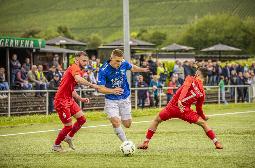 Im Derby auf dem Henterner Rasen gaben die SG Hochwald und der TuS Mosella Schweich von Beginn an Gas. Die zahlreich erschienenen Zuschauer durften sich bereits früh über Torraumszenen auf beiden Seiten freuen, die allerdings nicht genutzt wurden. So beispielsweise nach rund 20 Minuten, als Hochwalds Luca Heintel mit einem Elfmeter am Aluminium des Schweicher Tores scheiterte. Besser machte es Jens Schneider, der in der 28. Minute eine Hereingabe zur Schweicher Führung einschob. Bei dieser sollte es nur sechs Minuten bleiben, denn schon in der 34. Minute glich Tim Thielen nach einer Ablage aus. Hochwald spielte seine Angriffe nun besser aus und legte in der 40. Minute nach, als Robin Mertinitz Mosella-Keeper Gerhard per Heber schlug – 2:1 SGH. Noch in der Nachspielzeit der ersten Hälfte erhöhte Julian Bidon nach einer Ecke zum 3:1-Pausenstand.
