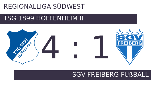In der 37. Minute traf 1899 Hoffenheim II zum ersten Mal ins Schwarze. Noch vor der Halbzeit legte 1899 Hoffenheim II seinen zweiten Treffer nach (43.). Mit der Führung für TSG 1899 II ging es in die Halbzeitpause. In der 78. Spielminute setzte sich TSG 1899 Hoffenheim II erneut durch und erzielte das vorentscheidende 3:0. TSG 1899 II musste den Treffer zum 1:3 hinnehmen (83.). 1899 Hoffenheim II baute den Vorsprung in der 86. Minute aus. Schlussendlich verbuchte TSG 1899 II gegen SGV Freiberg Fußball einen überzeugenden Heimerfolg.