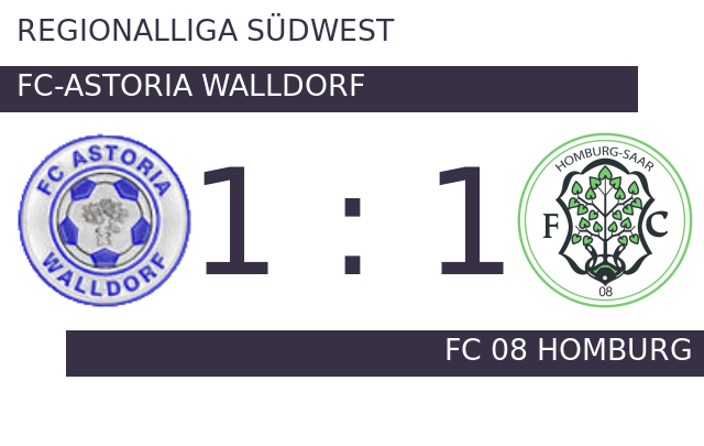 FC 08 Homburg ist nicht über ein 1:1-Unentschieden gegen FC-Astoria Walldorf hinausgekommen. Mit einem respektablen Unentschieden trennte sich FCA Walldorf vom Favoriten. FC Homburg hatte FCA im Hinspiel klar dominiert und am Ende deutlich mit 4:0 gesiegt.