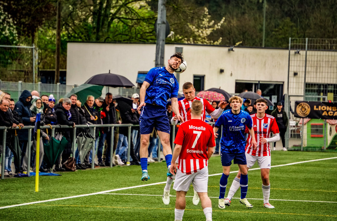 Auch diesmal war der Sieg von Stephan Schleimer und Co ungefährdet, weil die TuS zum richtigen Zeitpunkt die Tore machte und dem konterstarken Gegner kaum Vorstöße gestattete. So konnte der so stark und noch ohne Niederlage in dieses Jahr gestartete TuS Ahbach den Meister weder beeindrucken und schon gar nicht in die Bredouille bringen. Der frisch gebackene Rheinlandligaaufsteiger gewann nicht nur sein zwölftes Spiel in Folge, sondern bleibt auch vor eigenem Publikum ungeschlagen in dieser Saison. Die Mosella brachte sich nach zunächst ausgeglichenem Spielverlauf in der 34. Minute in Vorteil, als Niklas Cillien zur Führung traf – 1:0. Nach Steckpass von Eliah Dick lief Cillien allein auf das von Justin Hellenthal gehütete Tor des TuS Ahbach zu und schob die Kugel links unten ein. Kurz vor der Pause stellte Jens Schneider nach Maßflanke von Alex Schwarz in Folge einer traumhaften Kombination über mehrere Stationen auf 2:0 (42.) und als Eliah Dick fünf Minuten nach Wiederbeginn mit einem direkt verwandelten Freistoß das dritte Schweicher Tor erzielte, war die Partie entschieden – 3:0 (50.). Die Mosella schaltete einen Gang zurück und ermöglichte es dem bärenstarken Aufsteiger aus der Eifel, das Ehrentor zu markieren. Ein an ihm selbst verwirkter Foulstrafstoß brachte Nicolas Clausen zum 3:1 im Mosella-Gehäuse unter. „Es war ein absolut verdienter Sieg unterm Strich, Ahbach hat sich das Tor aber auch erarbeitet. Jetzt können wir den Meistertitel und den Aufstieg in die Rheinlandliga vor unseren Zuschauern gebührend feiern. Nach dem 3:0 hat uns die volle Zielstrebigkeit gefehlt“, hatte Schweichs Erfolgscoach Thomas Schleimer ausschließlich lobende Worte parat. Der wechselte auch munter durch und gab mit Lennard Wagner sowie Jonah Simon, der von Beginn an im Tor spielte, zwei A-Jugendspielern zusätzliche Spielpraxis. Seinen Startelfeinsatz rechtfertigte zudem Niklas Cillien mit einer starken Leistung.