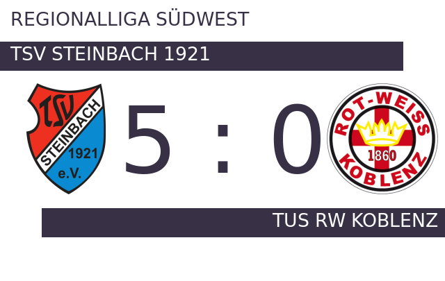 In Minute 20 traf Steinbach zum ersten Mal ins Schwarze. Noch in der ersten Hälfte erhöhte TSV Steinbach 1921 auf 2:0 (38.). Mit der Führung für Steinbach ging es in die Halbzeitpause. Mit dem 3:0 schien die Partie bereits in der 48. Minute mit Steinbach einen sicheren Sieger zu haben. Steinbach gelang in der 60. Spielminute der vierten Tagestreffer. In der 88. Minute legte Steinbach zum 5:0 nach. Letztlich feierte TSV gegen TuS RW Koblenz nach einer überzeugenden Darbietung einen verdienten Heimsieg.