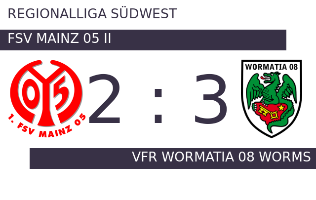 Gleich zu Spielbeginn traf der FSV II zur frühen Führung (2.). Weitere Tore gab es bis zum Pausenpfiff nicht und so ging es mit der Führung des FSV Mainz 05 II in die Kabine. In der 78. Minute bejubelte VfR Wormatia 08 Worms das 2:1. In der Nachspielzeit (90.) gelang dem FSV II der Anschlusstreffer. Kurz vor Schluss traf VfR Wormatia 08 Worms (90.). Am Schluss siegte Wormatia Worms gegen Mainz 05 II.